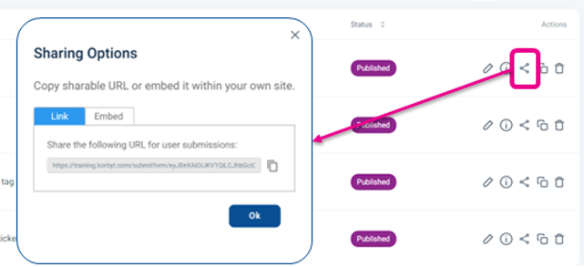 For Individual Templates you can access their Link and Code by clicking the Share Predefined Action Icon to the right of the template