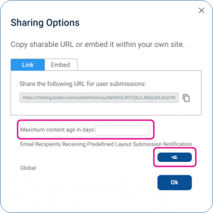 Sharing a Specific Folder of Templates allows you to control which templates the submitter has, and it enables you to specify Korbyt Users who should receive email notification that a Template in the folder has been submitted. it also allows you to specify a maximum validity date range for items submitted through that folder