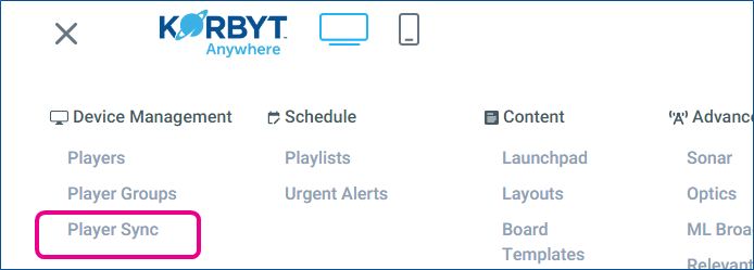 Open the Mega Menu in the upper left and select Player Sync in the Device Management Section