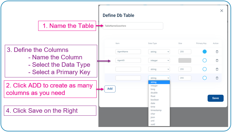 Click Defining the DB Table to create the structure for your database